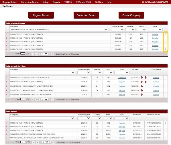 Return Under Process – This section lists all Returns that are under process. If the list is long, use the Filter for Quick Search. For direct access to a particular Return, click on the Return under ‘Return Under Process’ list. It could be either Regular or Correction