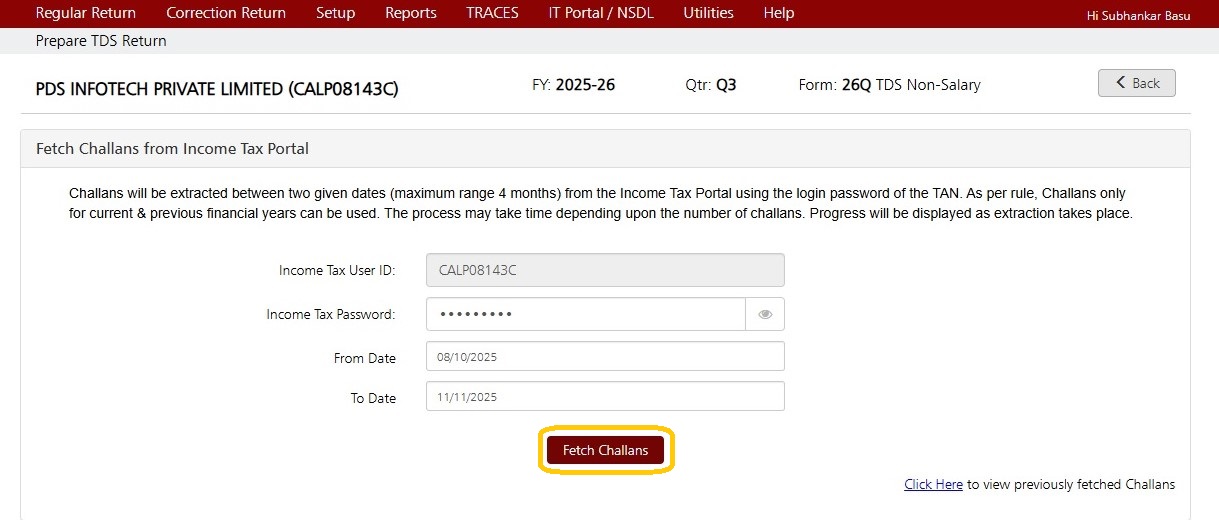 In order to extract the challans, click on ‘Fetch Challans from TRACES / IT Portal’ on ‘Regular Return’ screen, as shown below :